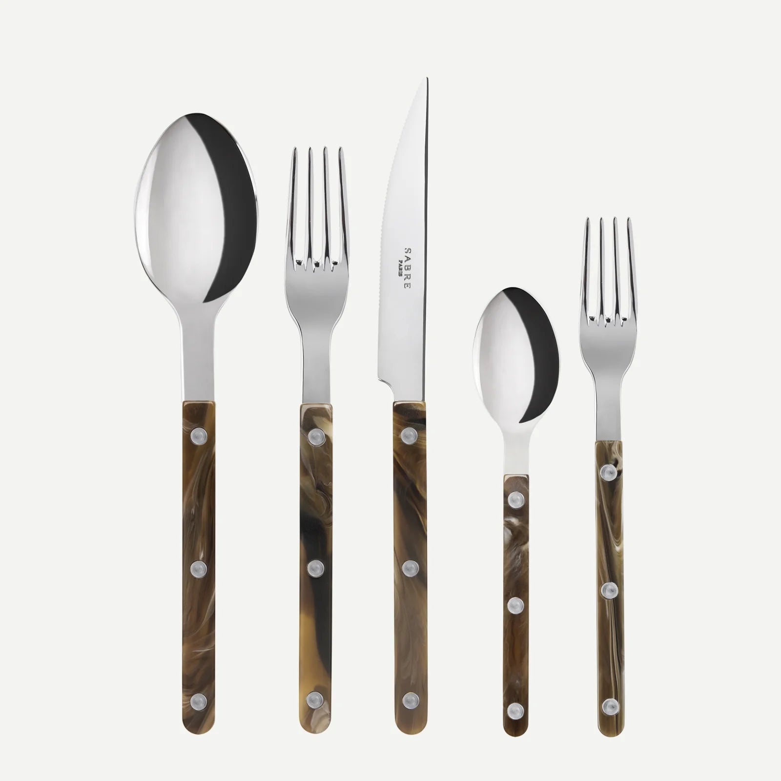 The Bistrot Buffalo collection from Sabre Paris is a bold reinterpretation of classic French bistro style, enhanced with the rich textures of a faux buffalo horn finish. The warm swirls of deep brown, caramel, and amber tones bring a sense of rustic luxury to the table, while the collection’s signature riveted handles add a timeless, authentic feel.